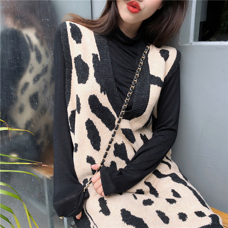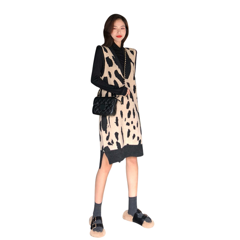 秋冬時尚女裝新款韓版chic慵懶風寬松百搭豹紋V領中長款針織馬甲