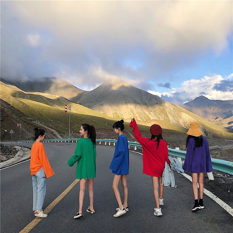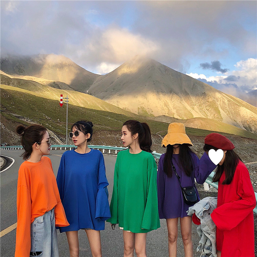 / 2018韓版寬松百搭純色圓領T恤女中長款長袖上衣小清新學生打底衫