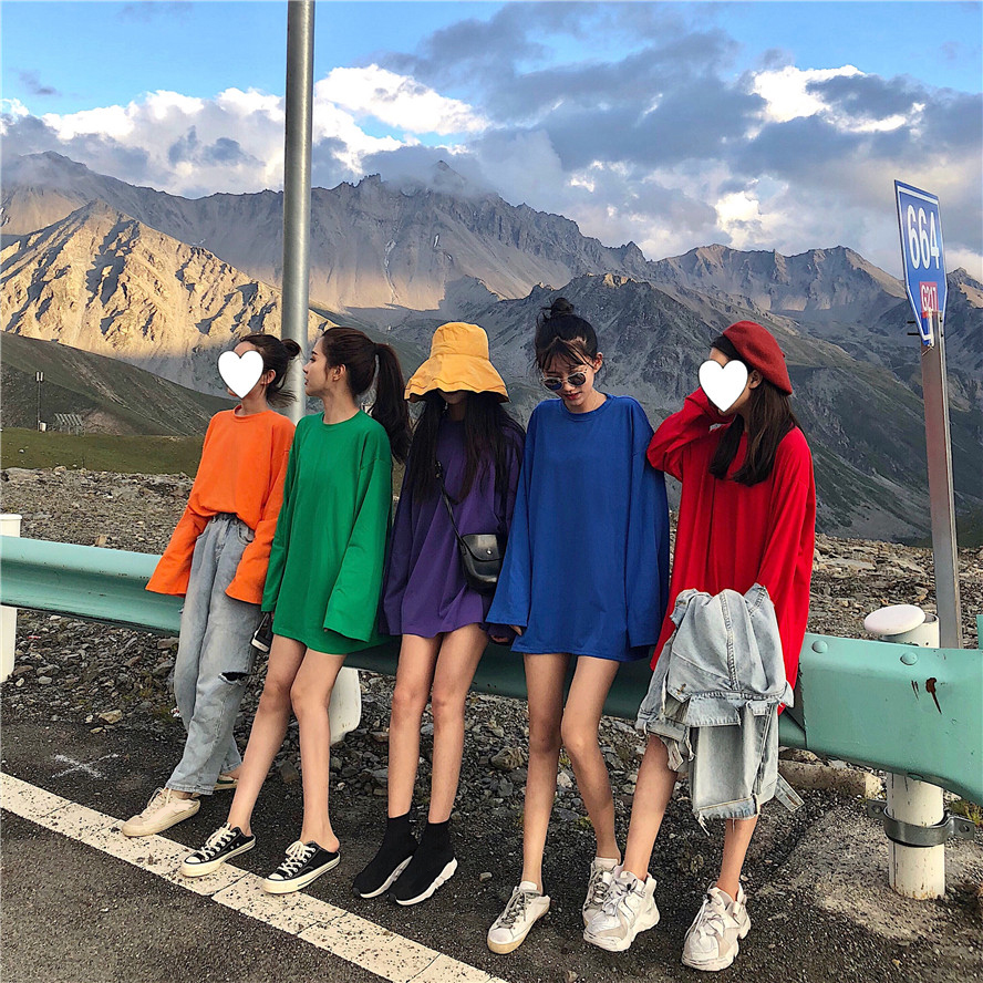 2018韓版寬松百搭純色圓領T恤女中長款長袖上衣小清新學生打底衫