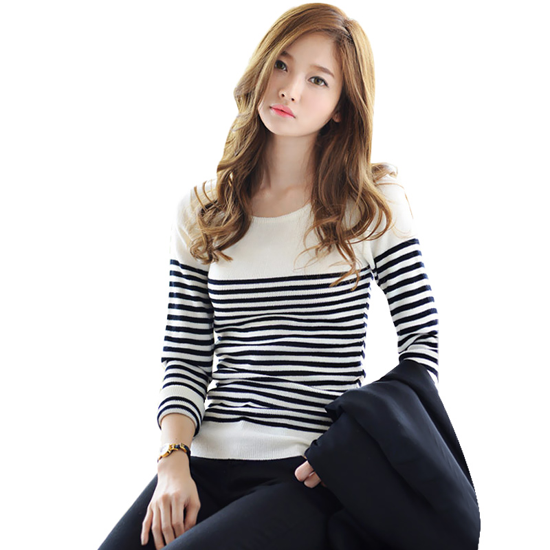 / 黑白條紋毛衣女春秋短款套頭打底毛衣女修身圓領針織打底衫女長袖