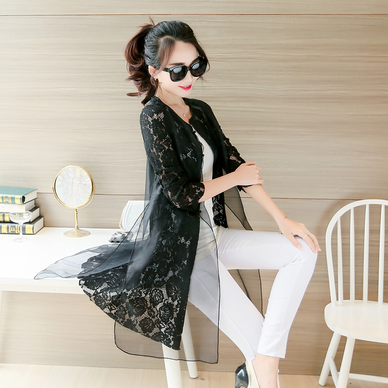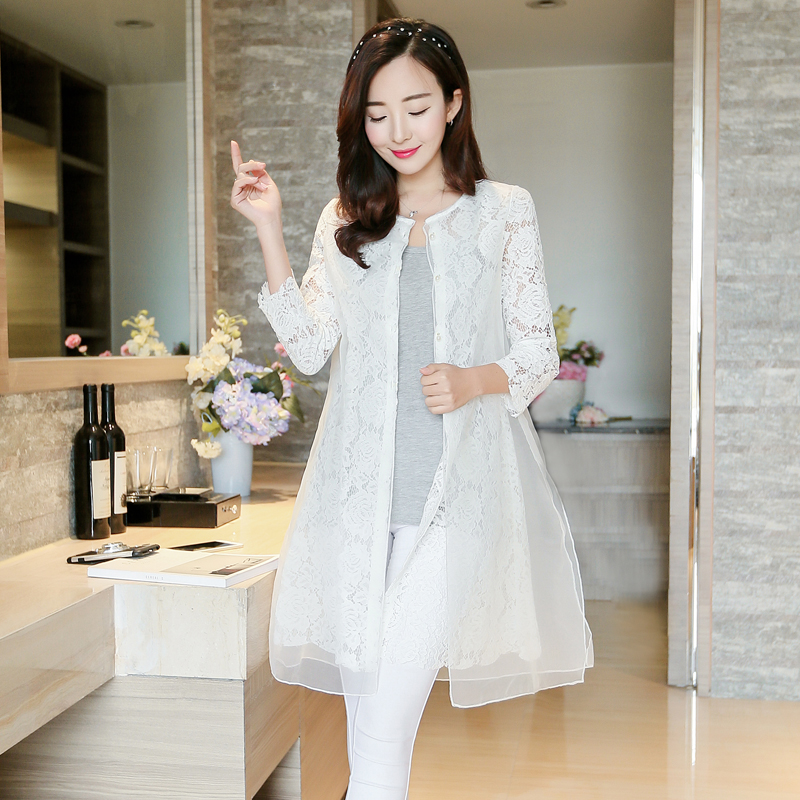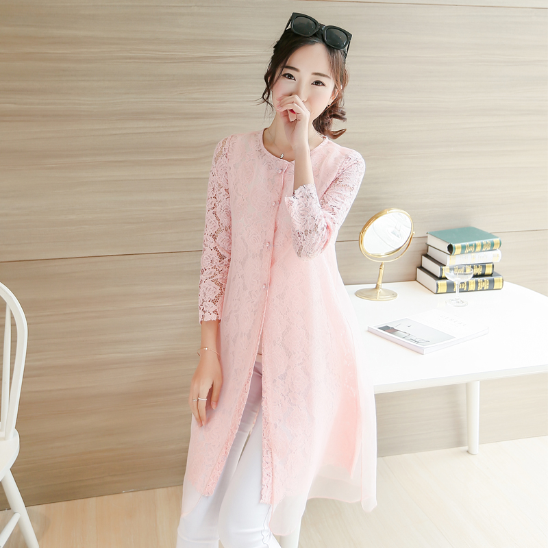 夏季防曬衣女中長款百搭薄開衫歐根紗外套春裝假2件蕾絲衫