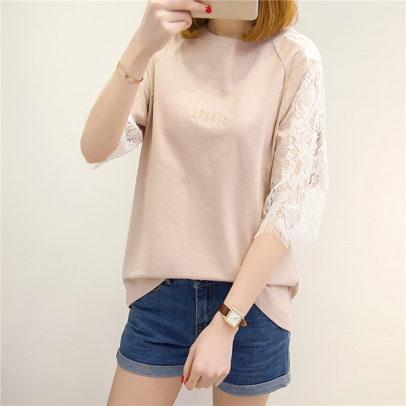 / 夏裝新款女上衣白色蕾絲t恤女中長袖鏤空打底體恤女短袖百搭