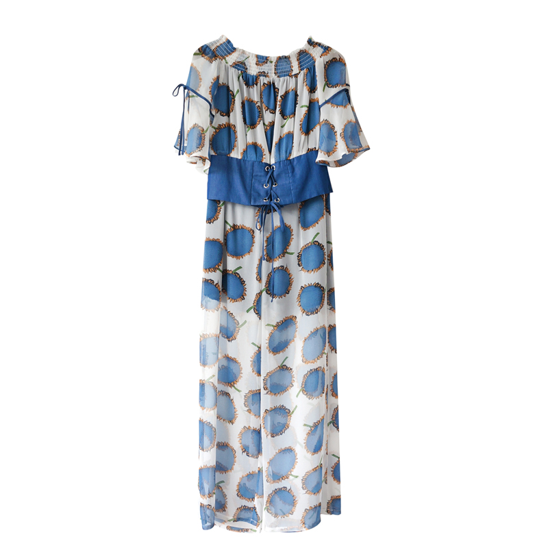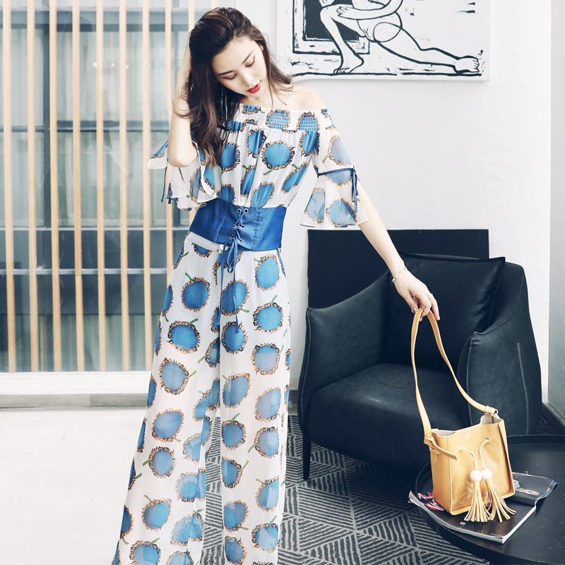 / S秀女神范雪紡套裝2018夏季新款時尚一字肩漏肩氣質闊腿褲兩件套