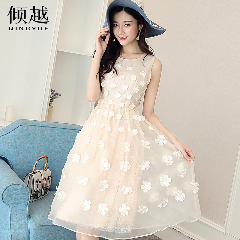 2017夏季新款甜美氣質淑女中長款蕾絲刺繡無袖顯瘦歐根紗連衣裙仙