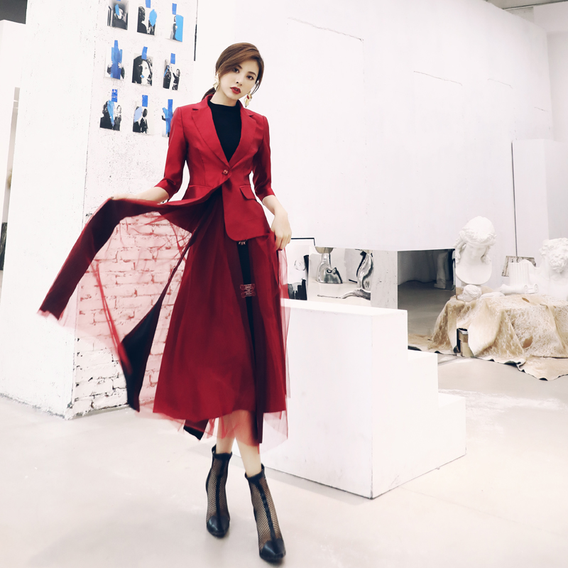 名媛氣質2018秋季新款西服外套紅色小西裝網紗釘鉆半身裙兩件套裝