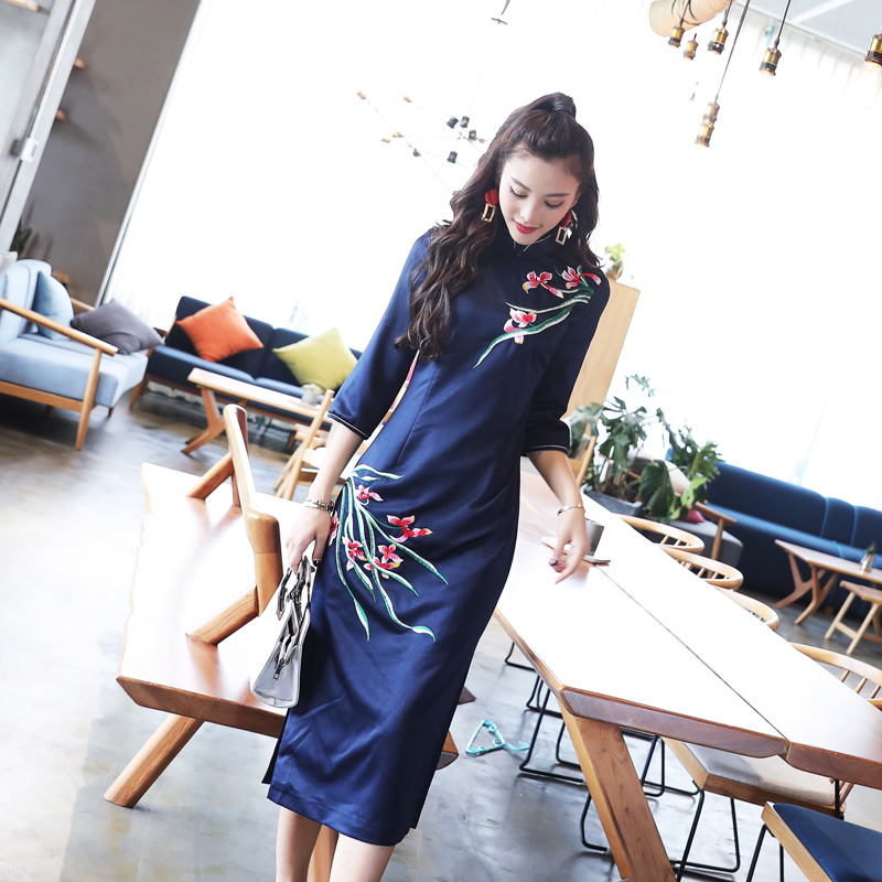 / 2018春季新款復古中式風修身收腰繡花鏤空旗袍通勤立領中長裙子潮
