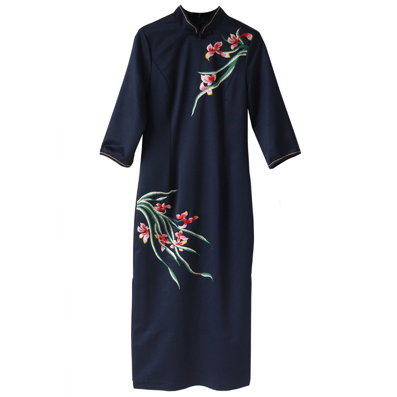 2018春季新款復古中式風修身收腰繡花鏤空旗袍通勤立領中長裙子潮