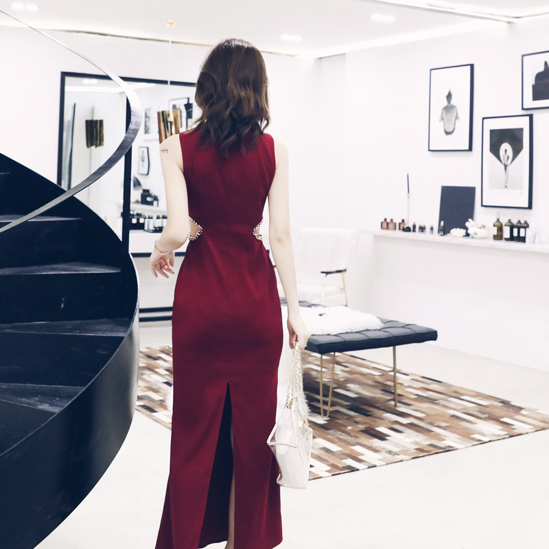 2018夏裝新款開叉性感修身顯瘦無袖長款露腰心機連衣裙紅色禮服裙