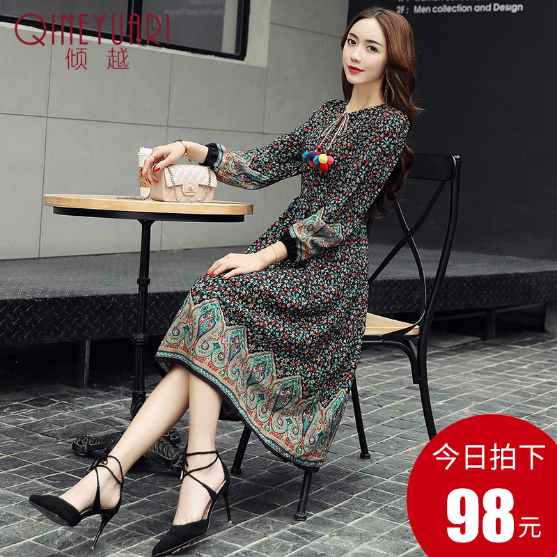 / 傾越2017春季新款修身小碎花色雪紡連衣裙女裝長袖中長款打底裙子