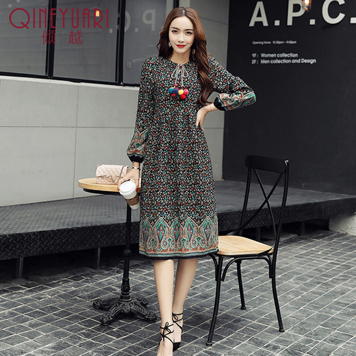 傾越2017春季新款修身小碎花色雪紡連衣裙女裝長袖中長款打底裙子