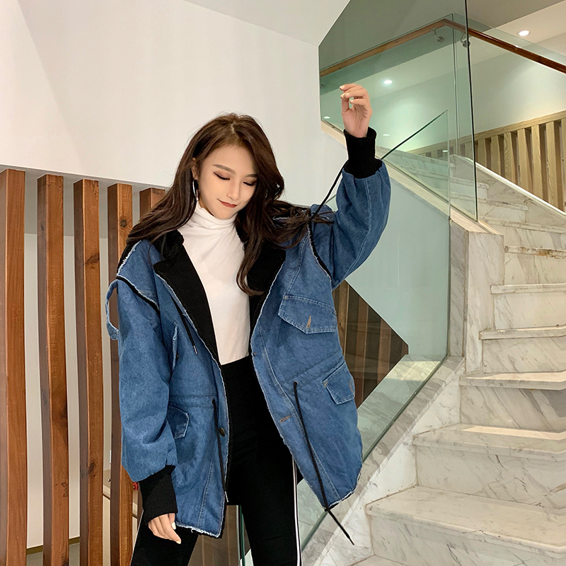 港味復古chic秋冬新款韓版加厚連帽設計感BF風時尚開衫女牛仔外套