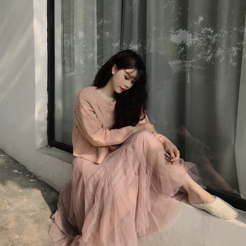 / 2018秋冬季新款寬松圓領套頭菱形針織毛衣+高腰中長款星星網紗裙