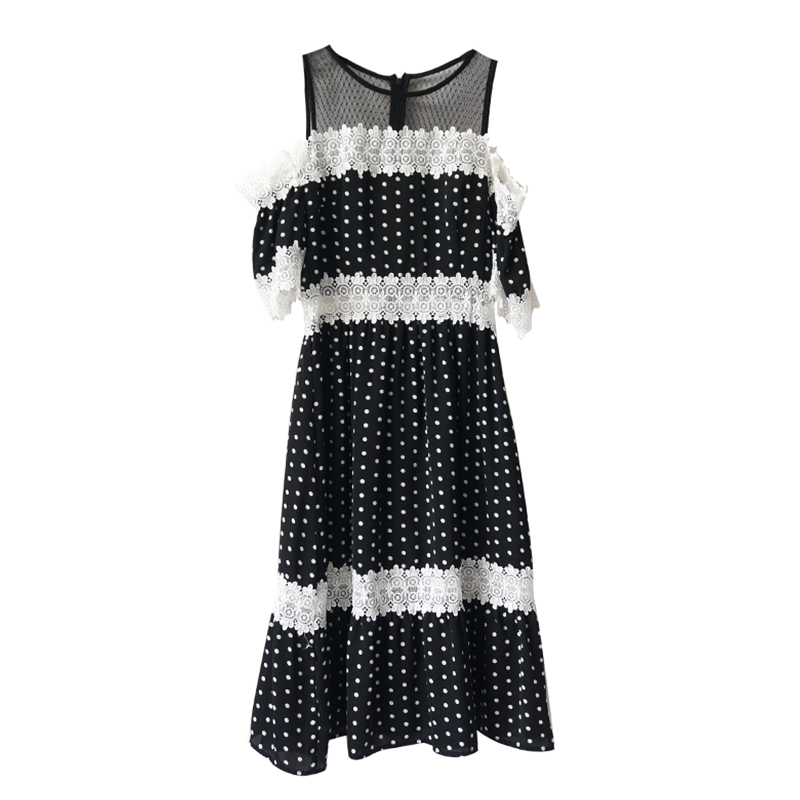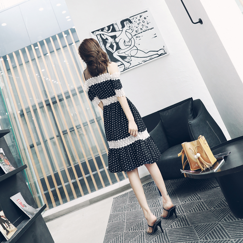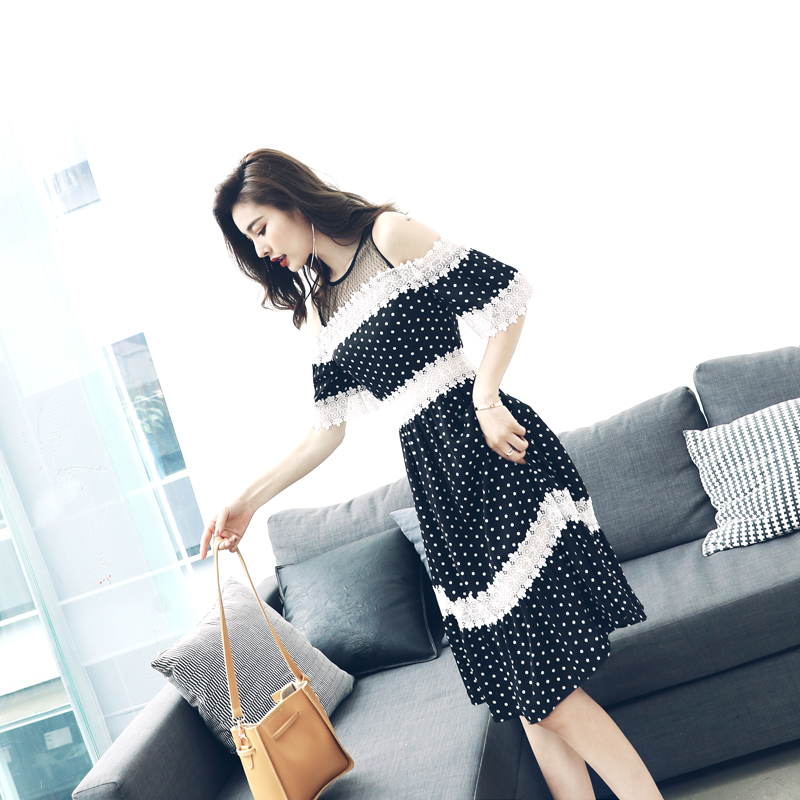 / 名媛氣質女蕾絲拼接波點露肩性感小心機夏高腰短袖中長款連衣裙