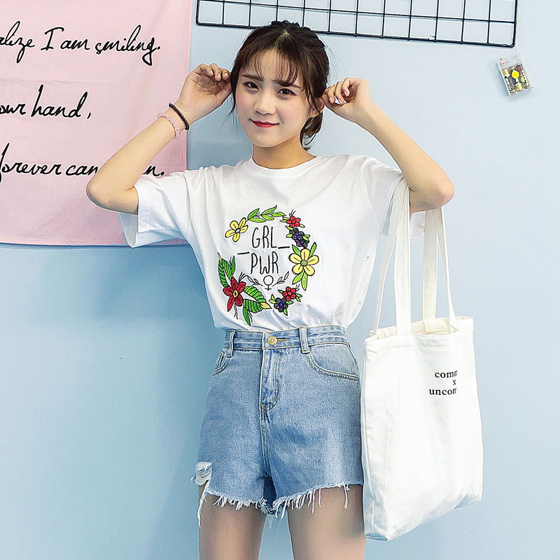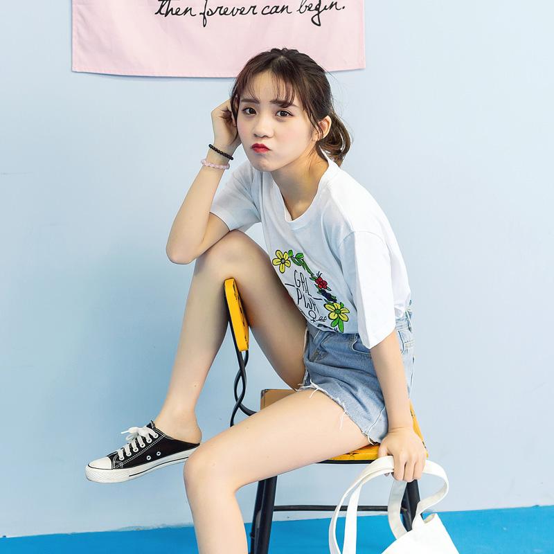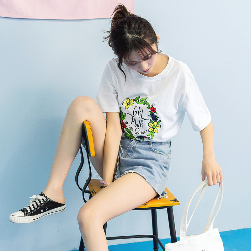 / 夏裝新款韓版女裝刺繡短袖T恤上衣寬松棉質潮打底衫學生上衣