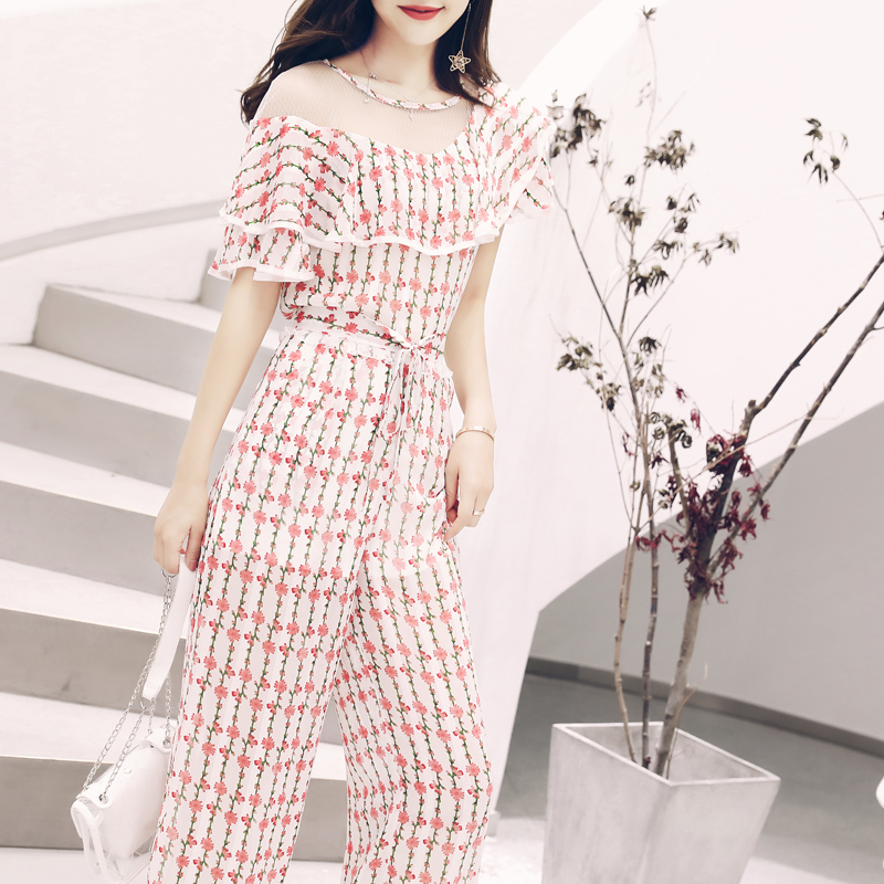 時尚夏季網紅短袖夏裝女套裝2018新款名媛印花闊腿長褲氣質兩件套
