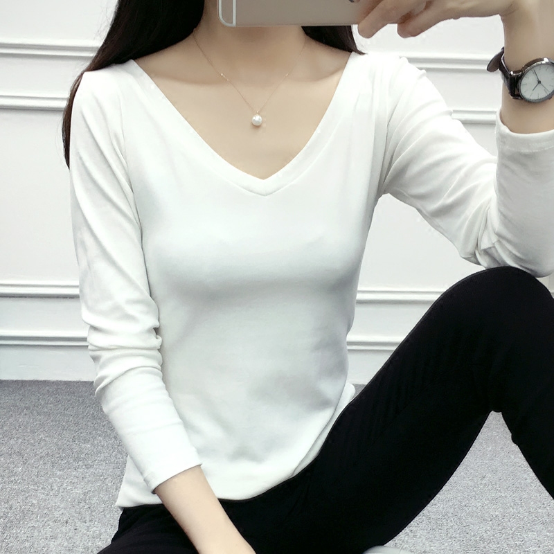 秋裝棉v領百搭長袖T恤女打底衫外穿大碼顯瘦女裝上衣潮