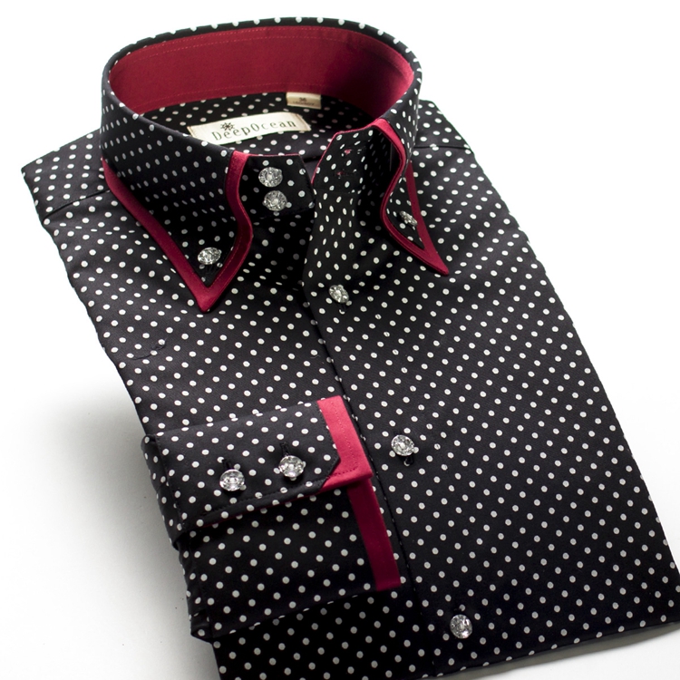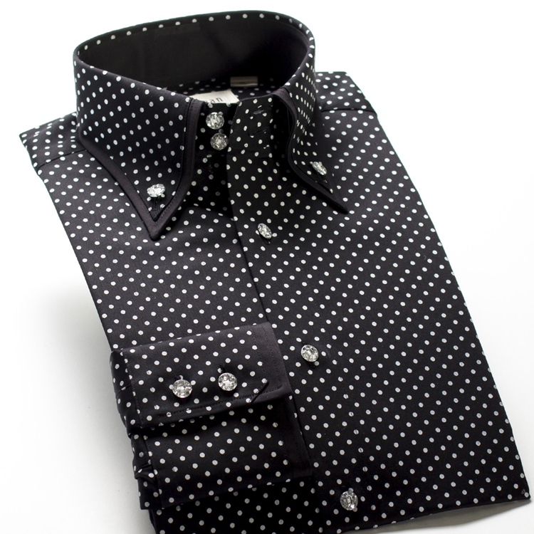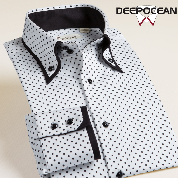 / 深海高領黑白波點襯衫男長袖絲光棉韓版修身大領襯衣純棉免燙男裝