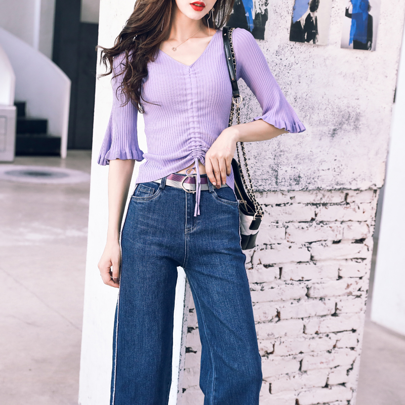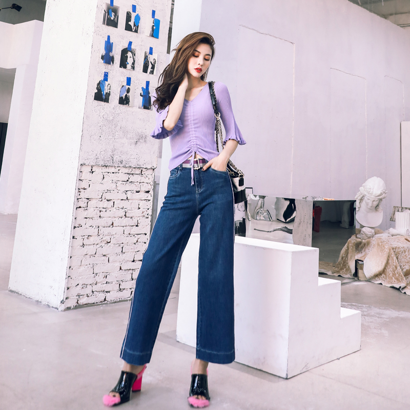 / 牛仔闊腿褲套裝女秋季韓版2018新款時髦女裝針織衫上衣休閑兩件套