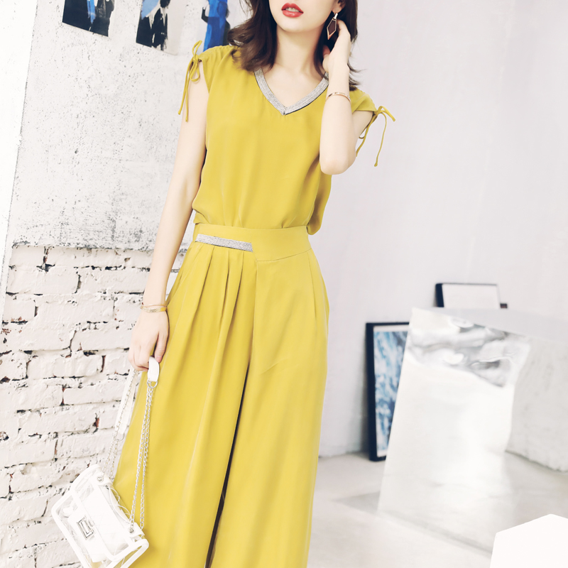 / S秀2018夏季新款女裝時尚女神范休閑修身氣質純色闊腿褲套裝潮