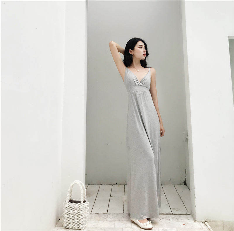 2018新款韓范港味復古晚晚同款度假風莫代爾高腰吊帶連衣裙長裙女