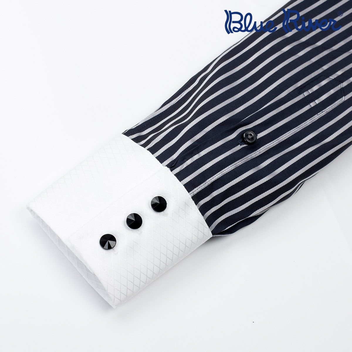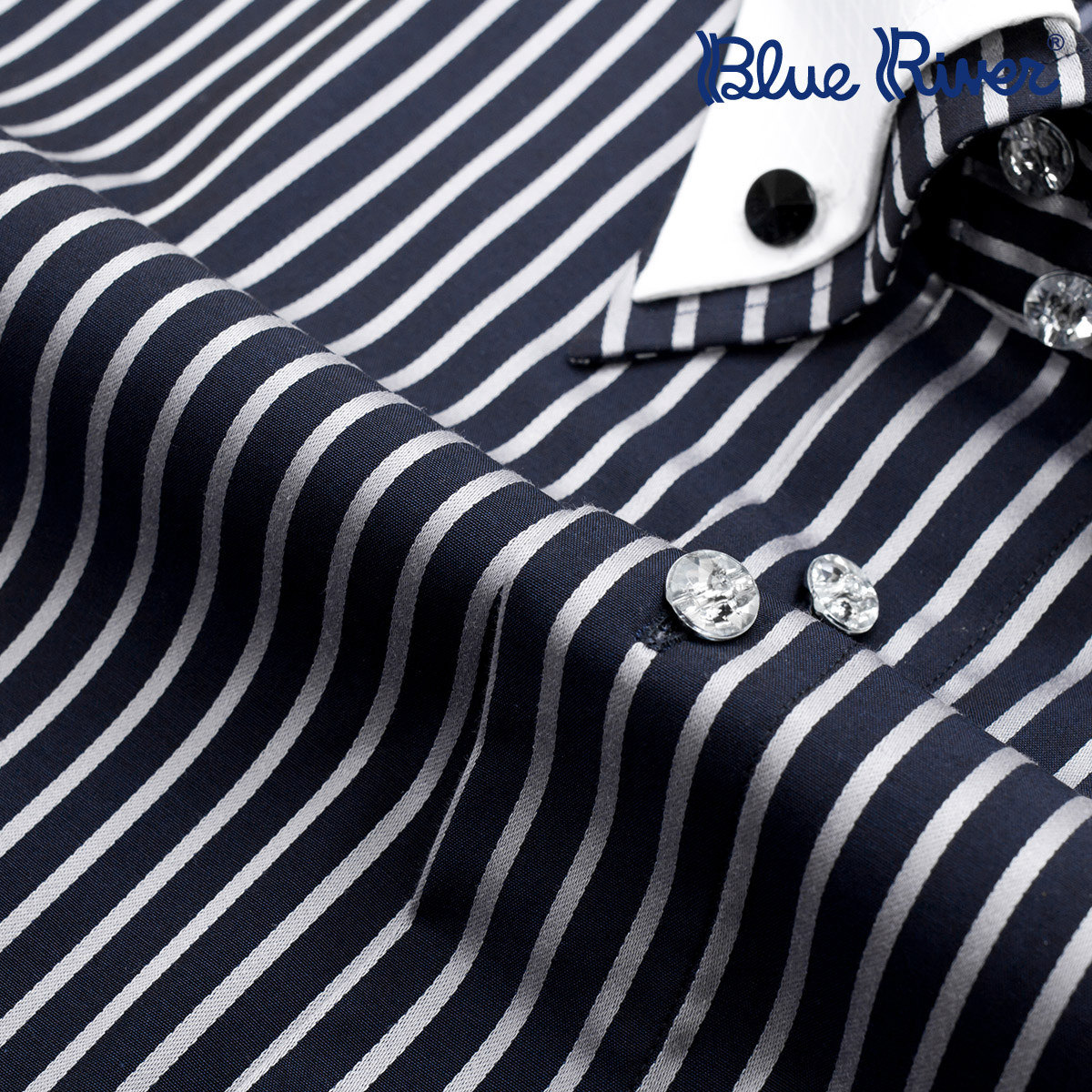 襯衫襯衣男長袖藍河藍白條紋雙層領韓版修身免燙純棉商務正裝