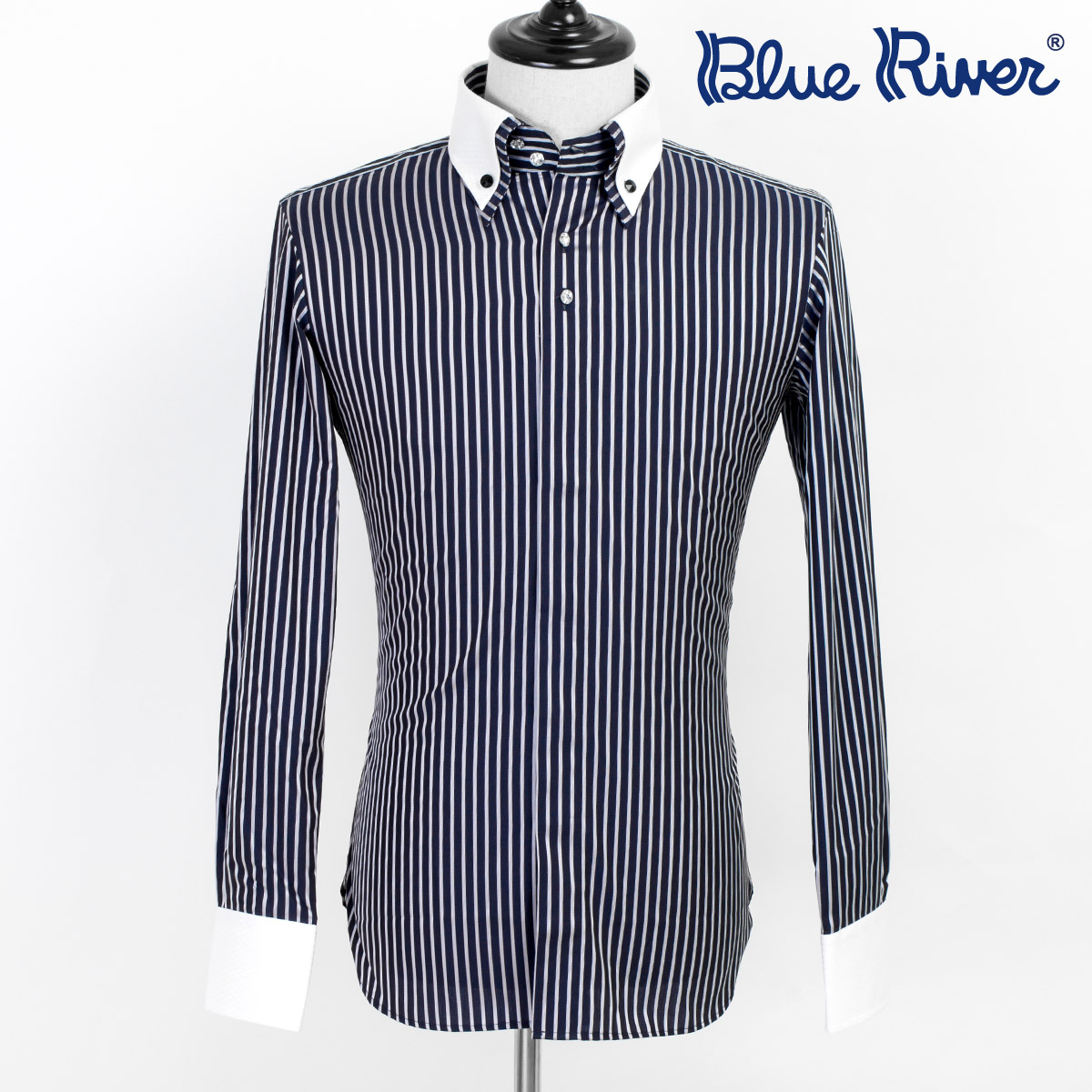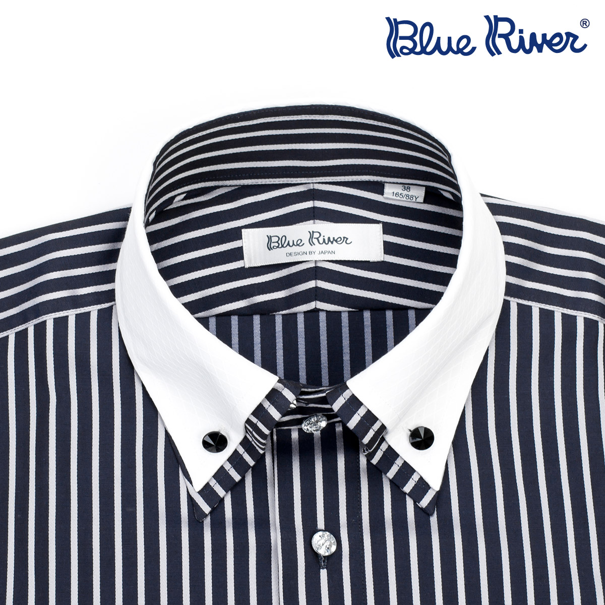 / 襯衫襯衣男長袖藍河藍白條紋雙層領韓版修身免燙純棉商務正裝