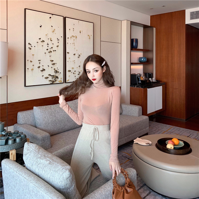 2018秋裝新款彈力修身長袖打底衫女chicT恤堆堆領內搭初秋上衣潮