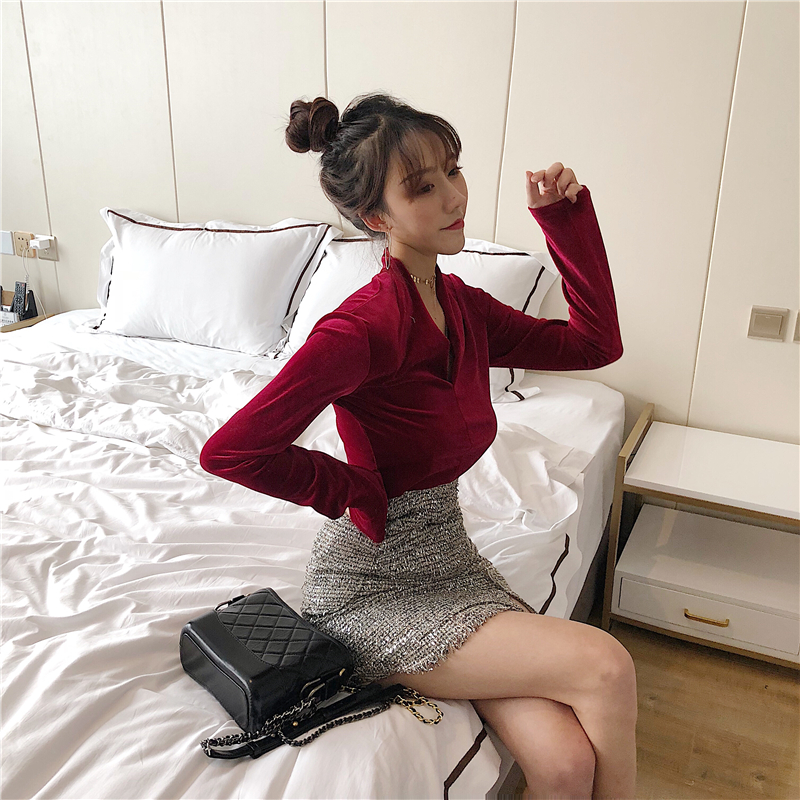港味復古chic風2018秋冬新款韓版V領顯瘦女裝絲絨長袖上衣打底衫