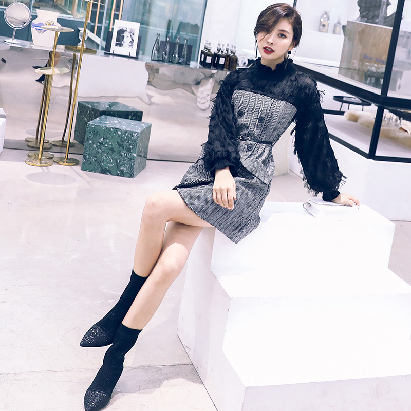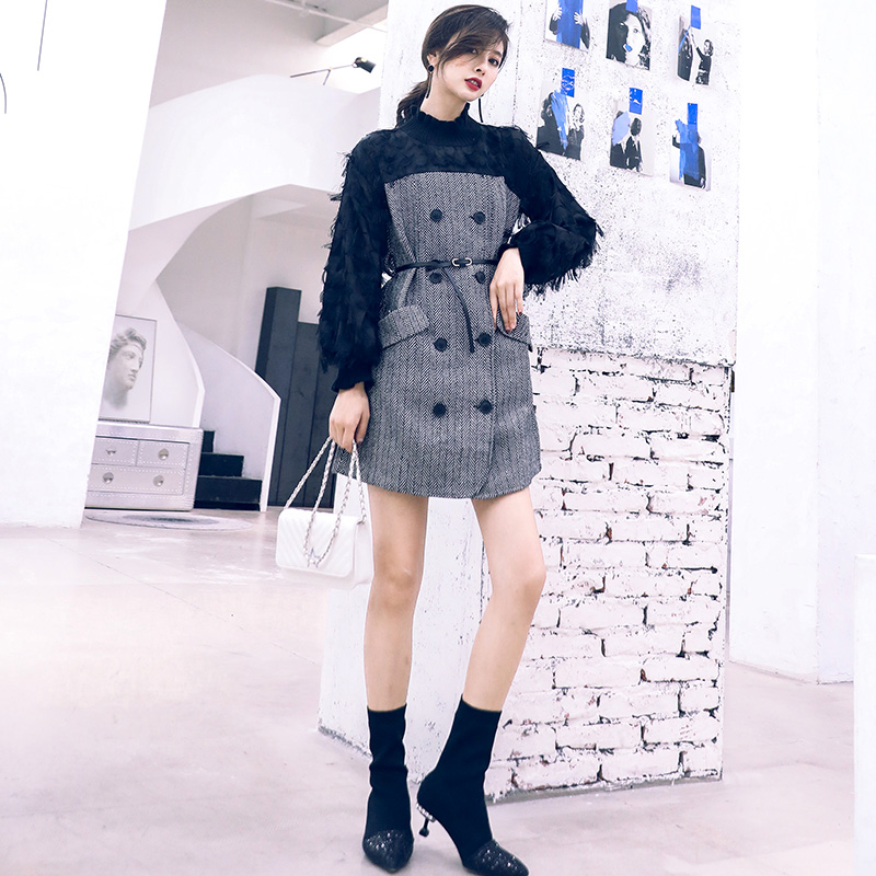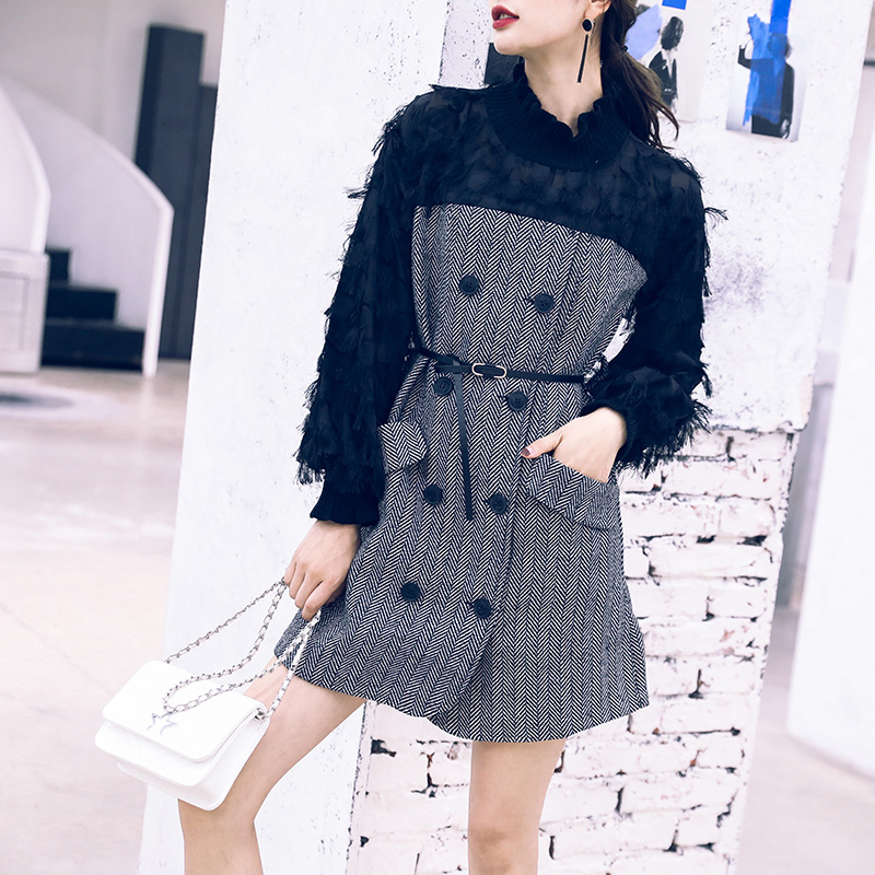 / 連衣裙女2018秋冬款長袖a字裙港味初戀復古拼接中長款條紋打底裙