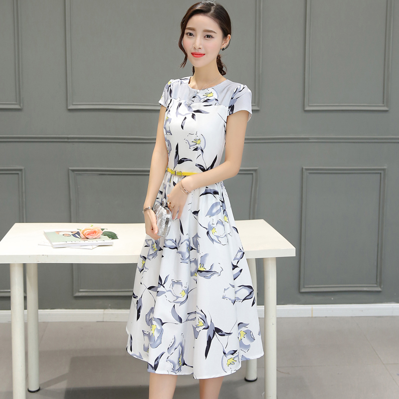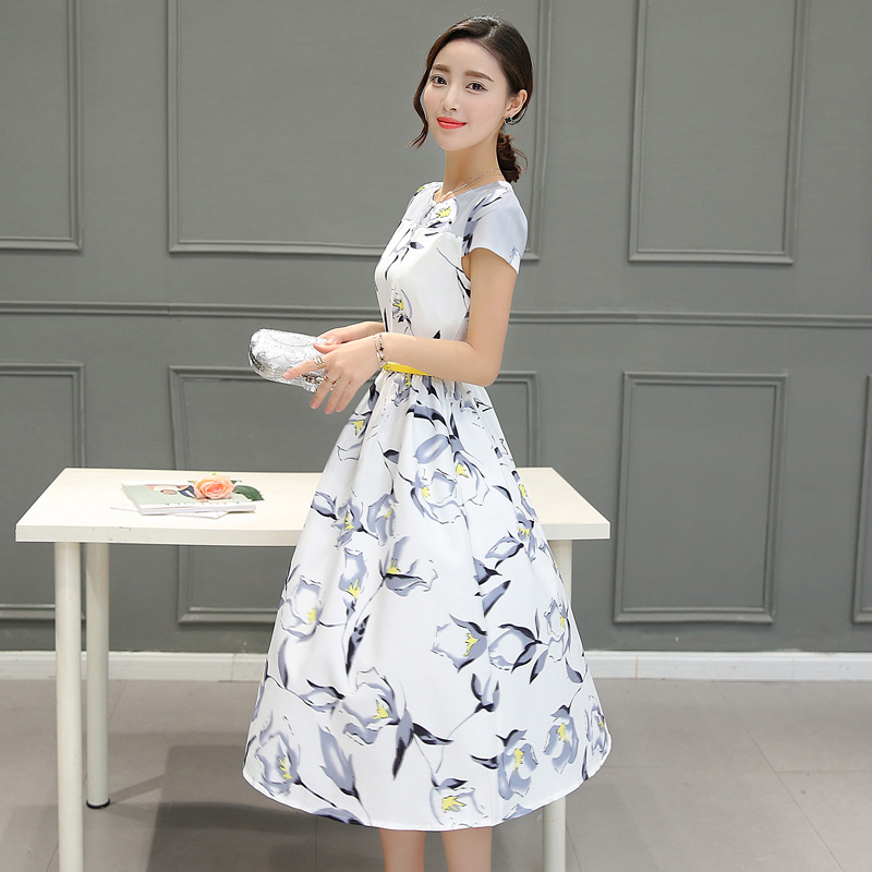 / 實拍新款韓版淑女修身顯瘦a字裙子時尚印花短袖中長款連衣裙女裝