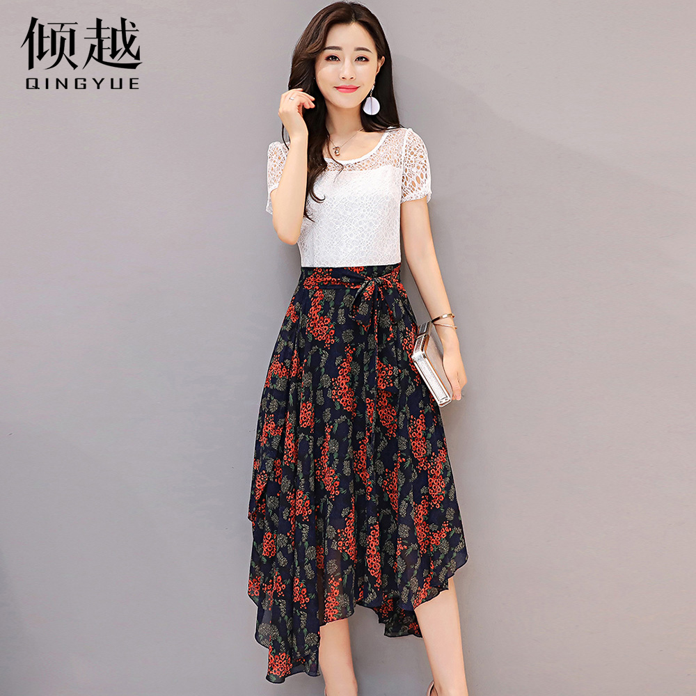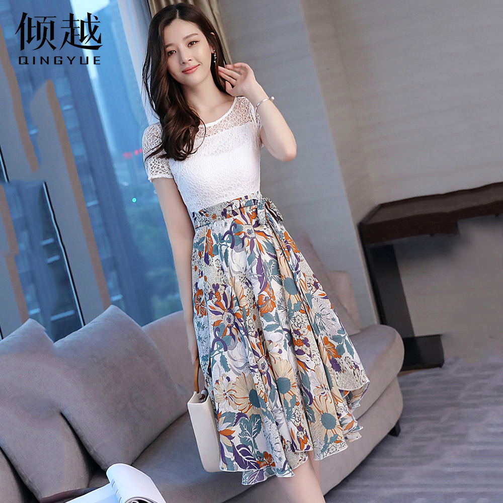 蕾絲連衣裙夏季2017新款女裝修身小清新氣質碎花雪紡中長a字裙子