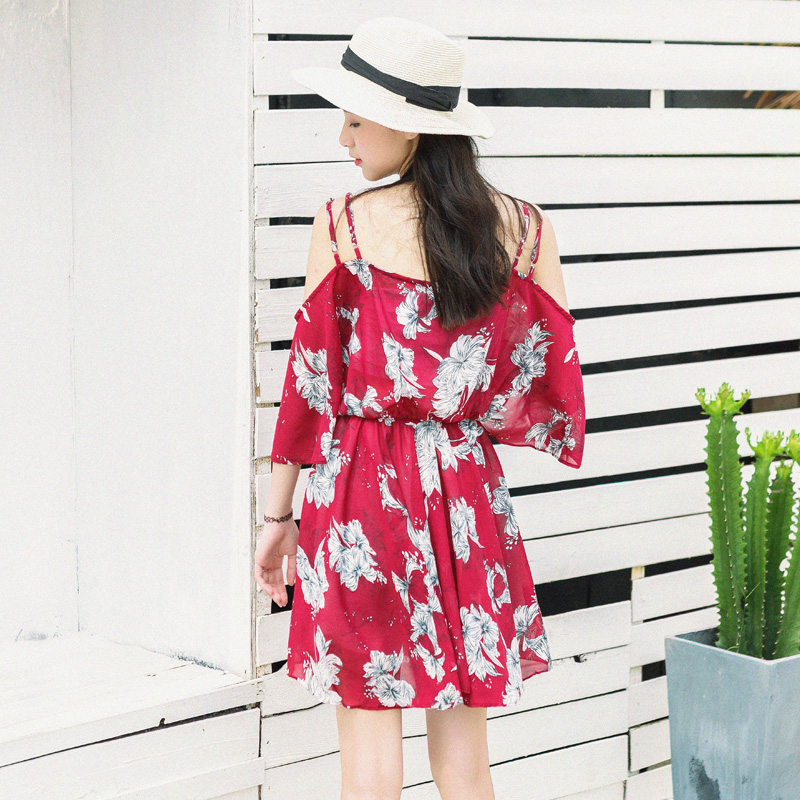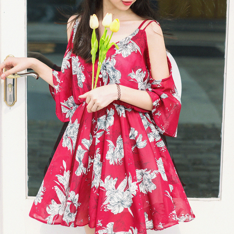夏裝新款韓版女裝復古花色連衣裙喇叭袖漏肩雪紡印花度假裙子