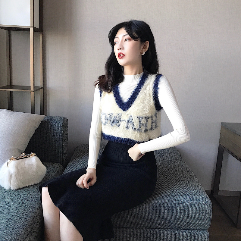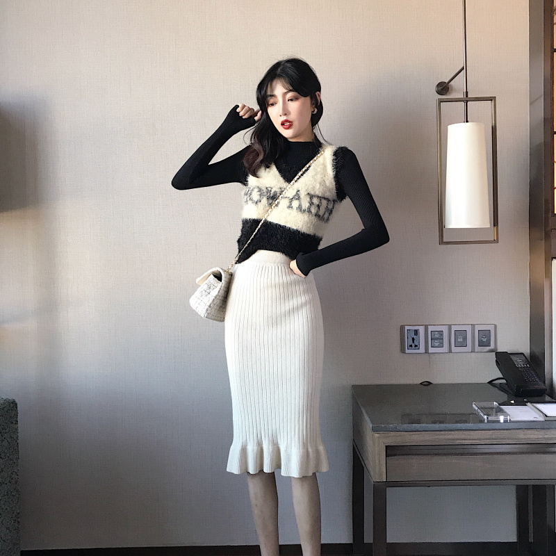 韓版女神套裝秋冬新款百搭毛毛針織馬甲背心女+打底衫+針織包臀裙
