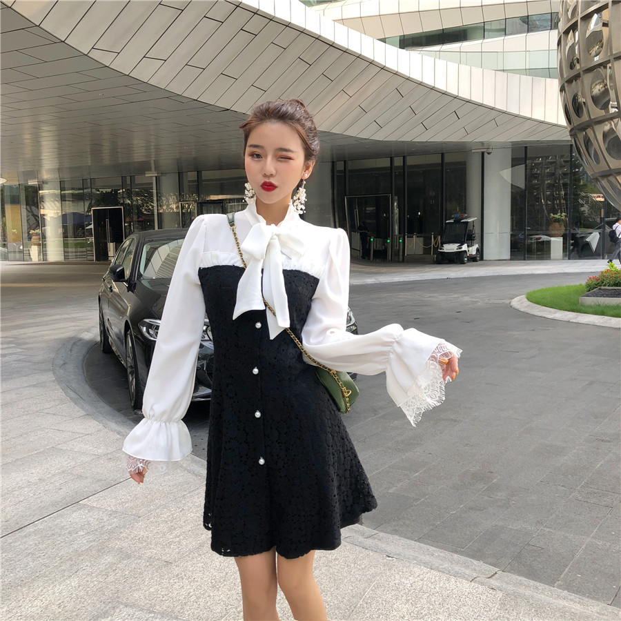 小香風2018新款韓版甜美百搭系帶蝴蝶結蕾絲拼接雪紡收腰連衣裙女