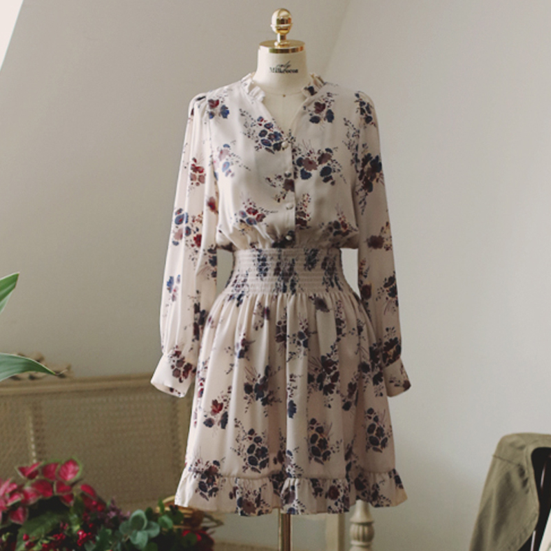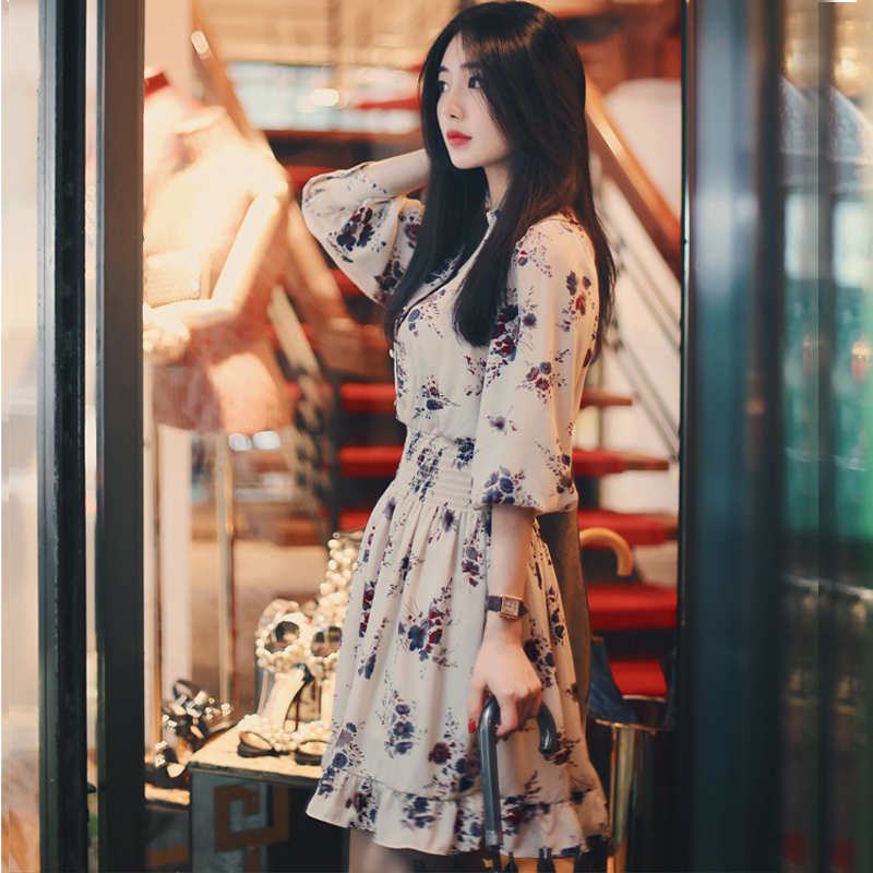 / 春夏裝新款氣質印花單排扣長袖淑女時尚大碼連衣裙修身韓版女