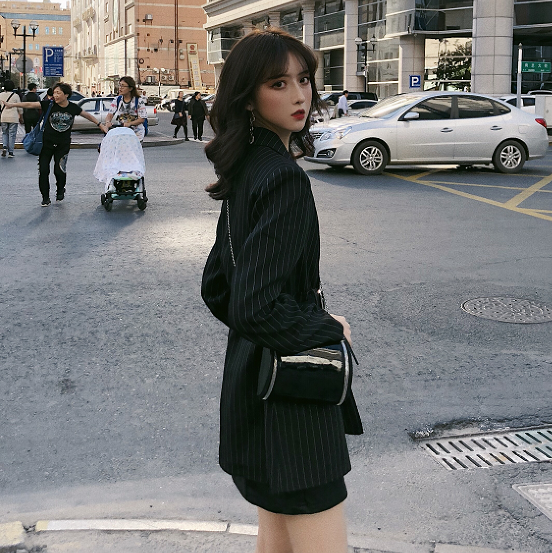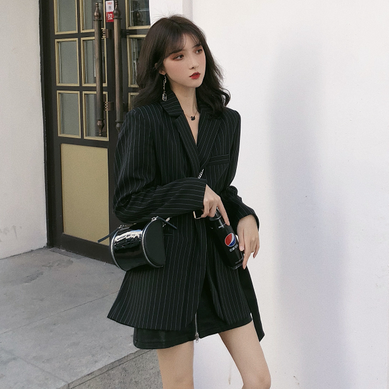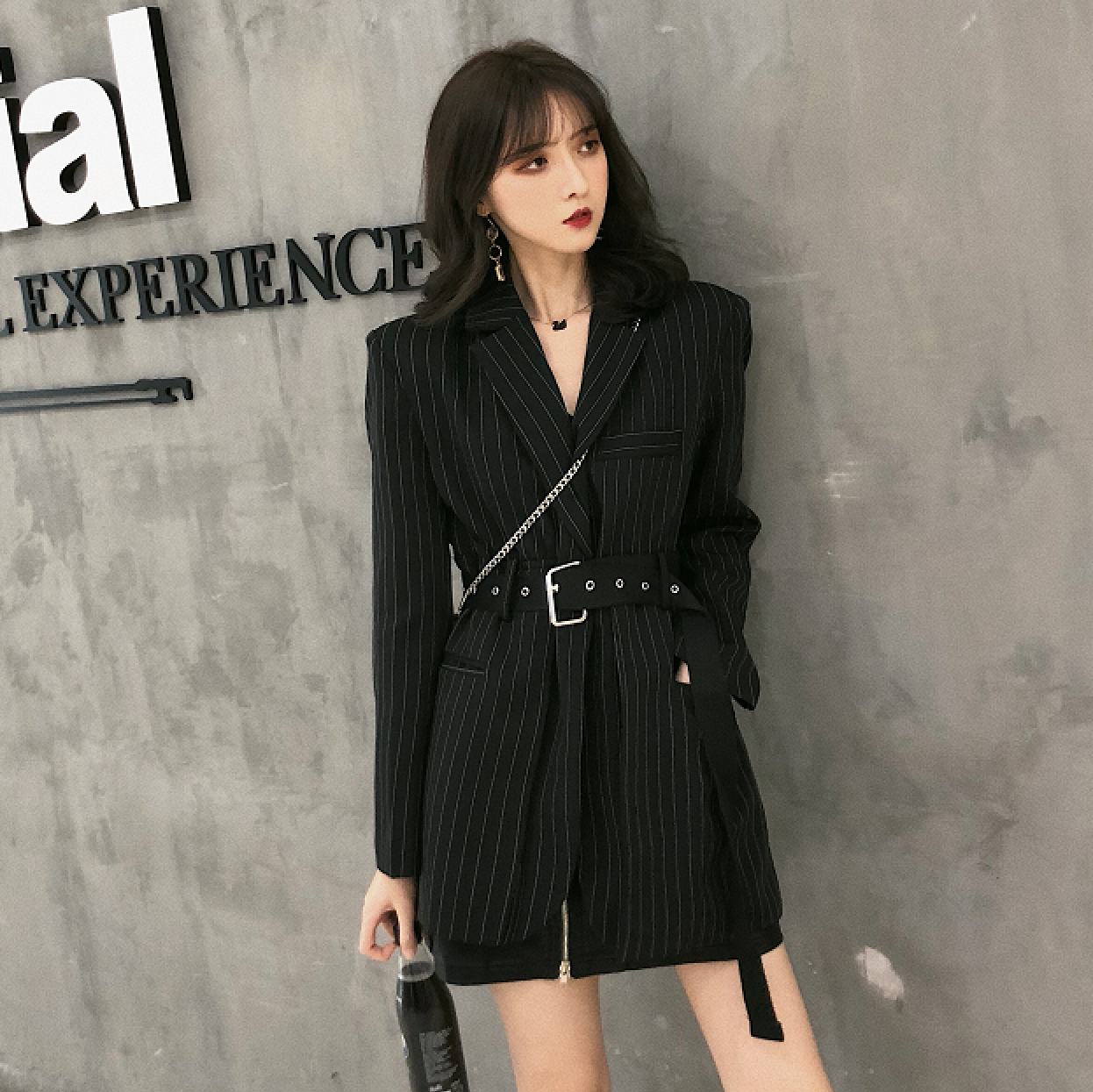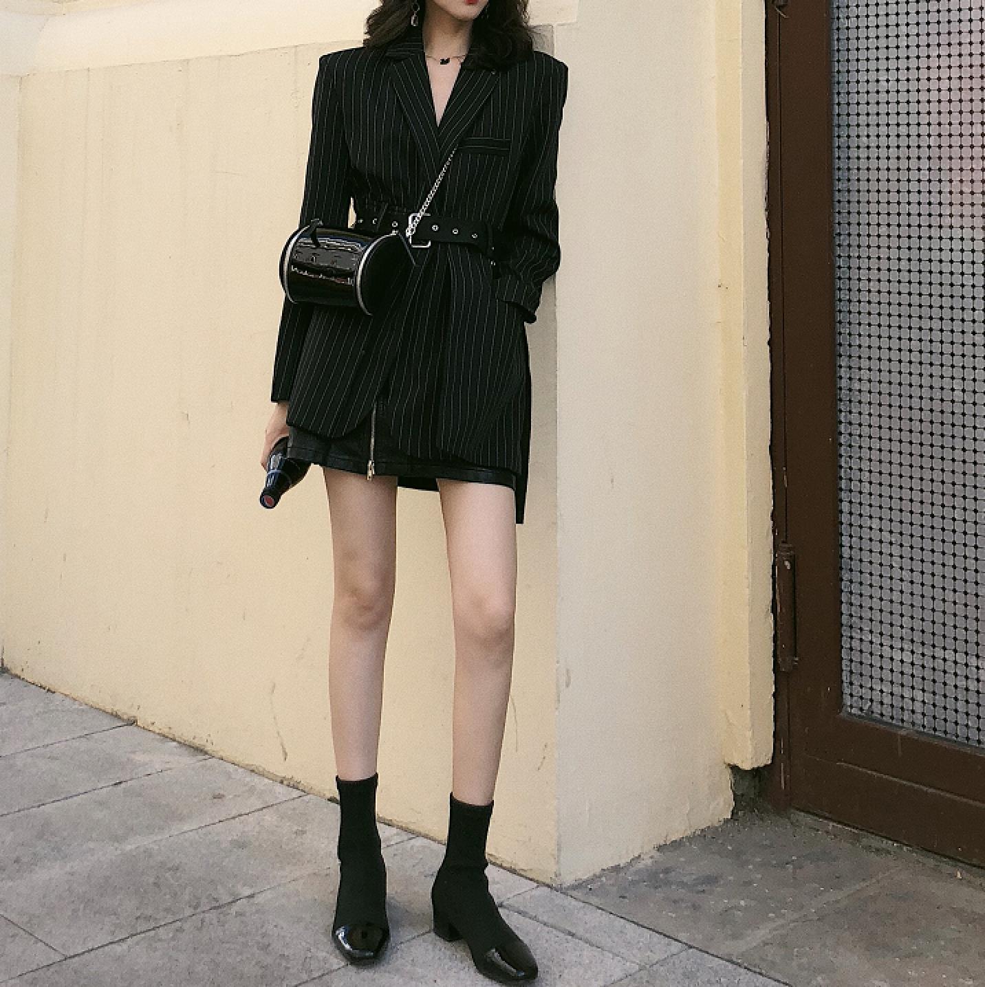 / 時尚小香風中長款復古氣質秋款條紋寬松chic百搭西裝外套女帶腰帶