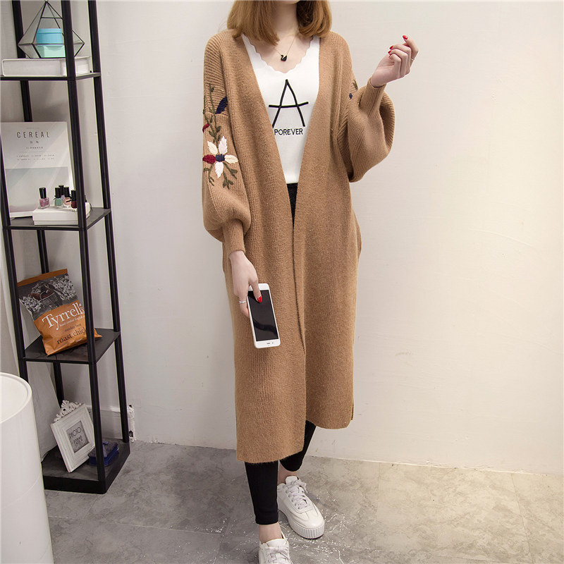 / 春裝新款個性刺繡寬松大碼毛衣女中長款長袖針織衫開衫外套潮