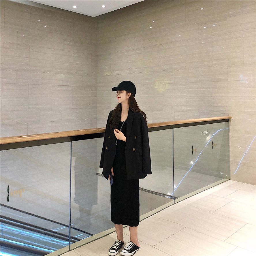 西裝套裝女chic外套寬松港風復古小西服V領針織吊帶連衣裙兩件套