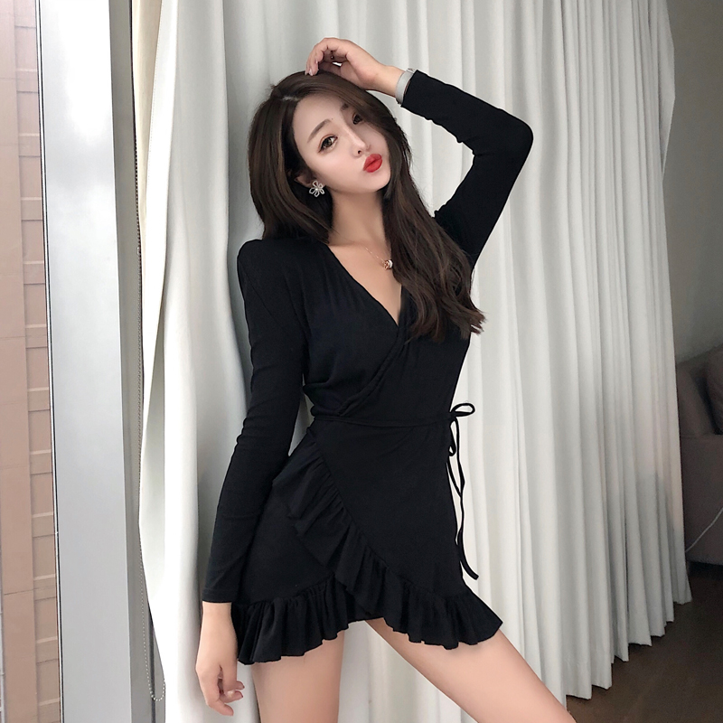 小心機新款性感修身柔美女人味荷葉邊V領一片式側系帶連衣短裙潮