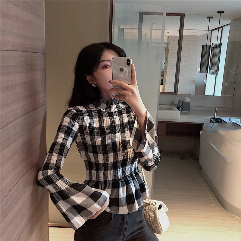 / chic秋冬新款韓版打底顯瘦氣質皺褶收腰修身高領喇叭袖格子上衣女