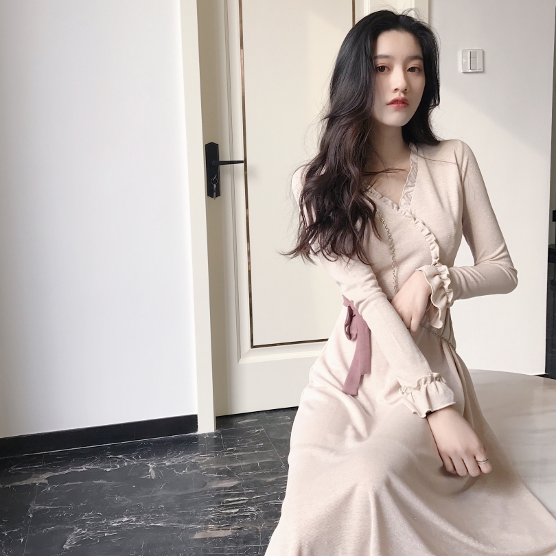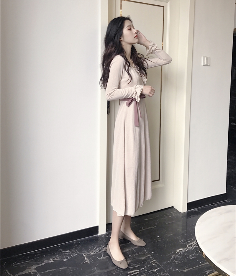 晚晚風新款韓版百搭中長款森女系時尚小清新chic花邊系帶連衣裙潮