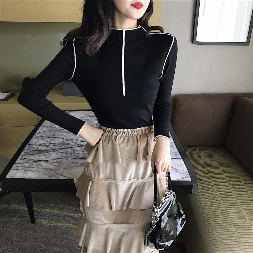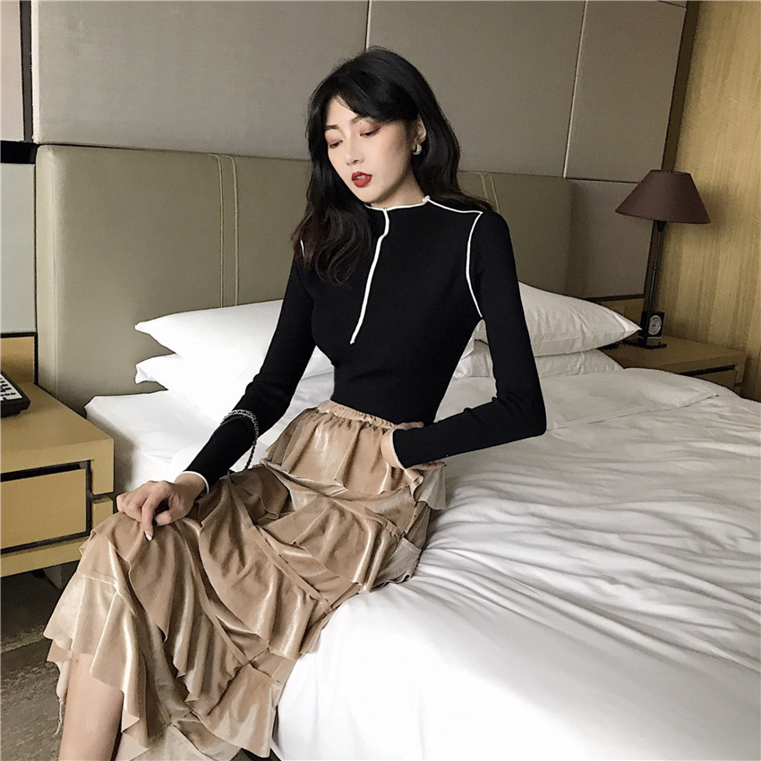 / 2018秋款長袖復古打底針織衫氣質長款蛋糕裙兩件套時尚chic套裝女