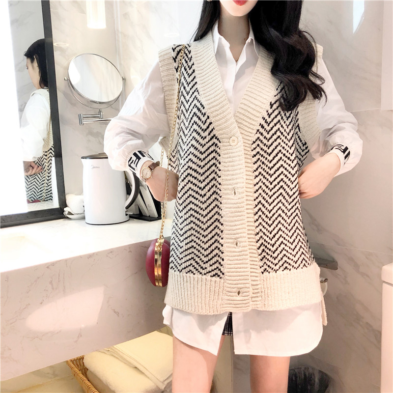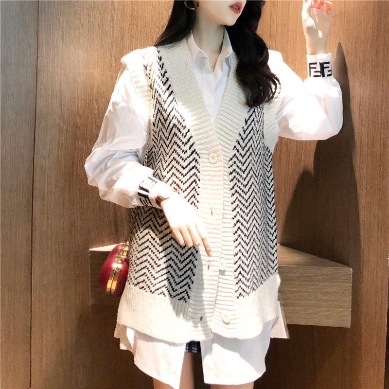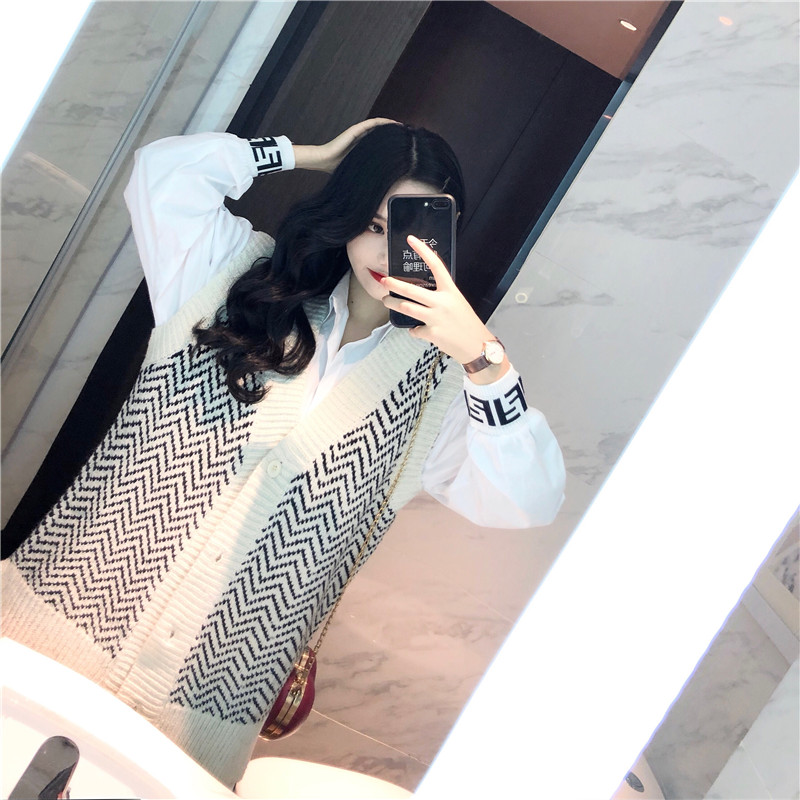 / 復古韓國chic風寬松顯瘦白襯衣+條紋毛衣女2018新款無袖開衫馬甲