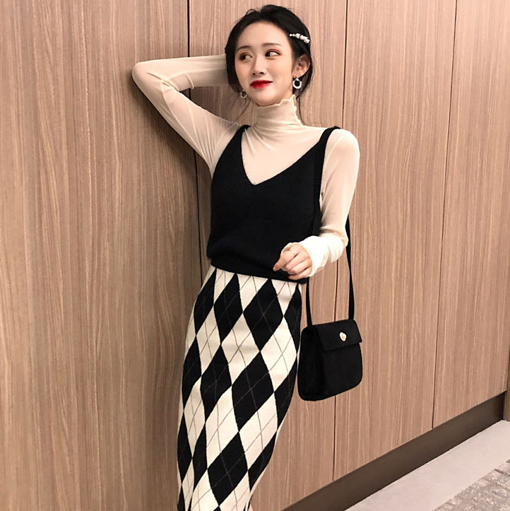 / 復古女神套裝秋冬新款馬海毛小吊帶+網紗打底衫女+菱形針織高腰裙