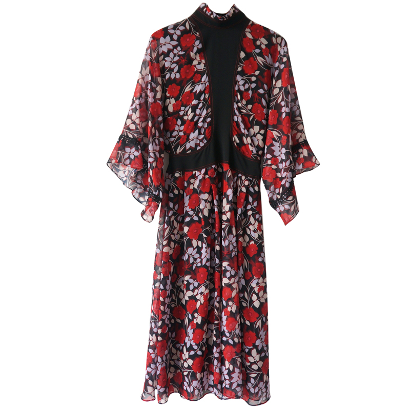 / S秀2018夏裝新款復古時尚蝙蝠袖印花裙中高腰顯瘦雪紡連衣裙子