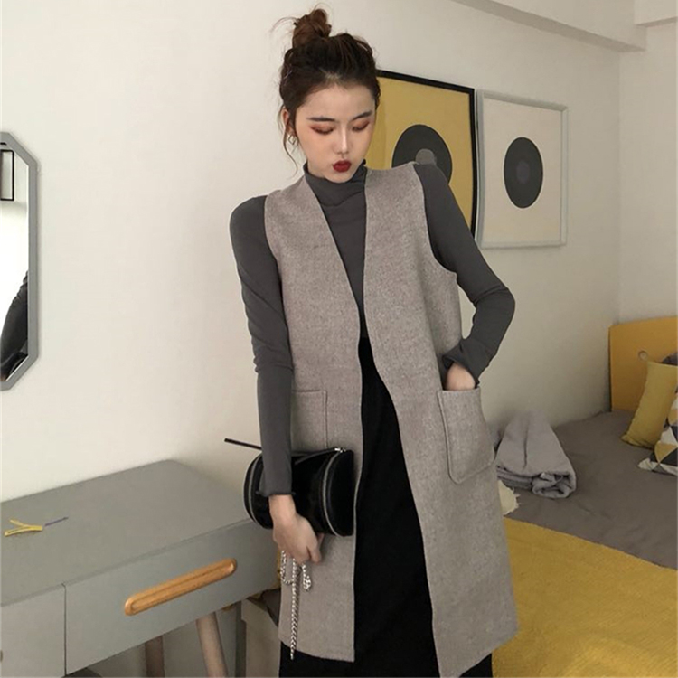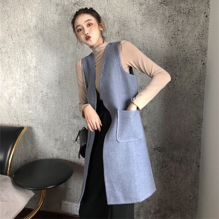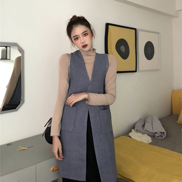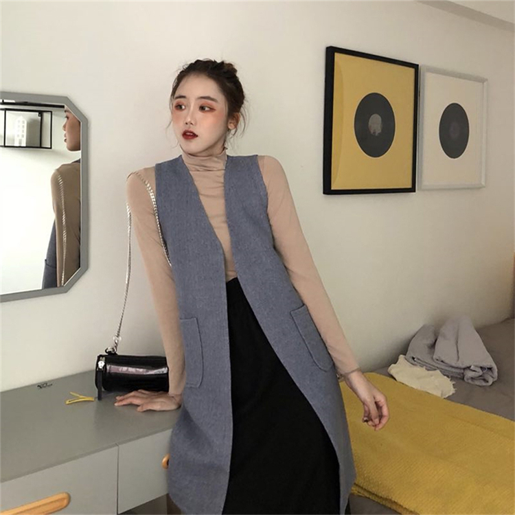 藍色馬甲|灰色馬甲|杏色打底衫|灰色打底衫|黑色半身裙
