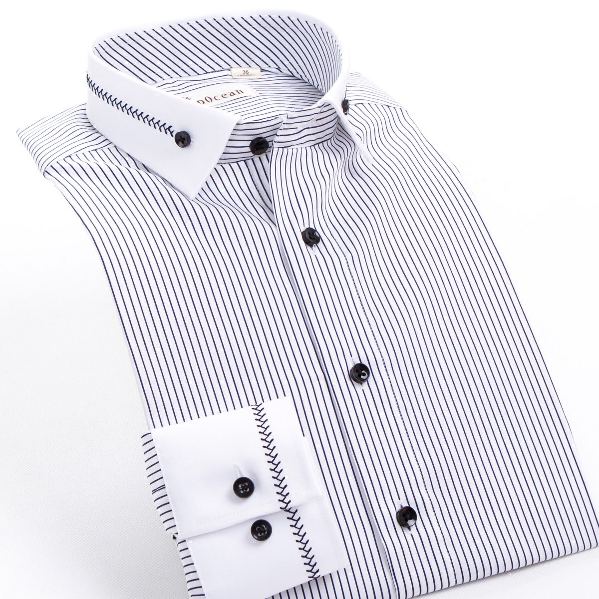 / 深海男士長袖免燙粉紅色條紋絲光棉襯衫 拼接鑲邊領男裝襯衣秋裝