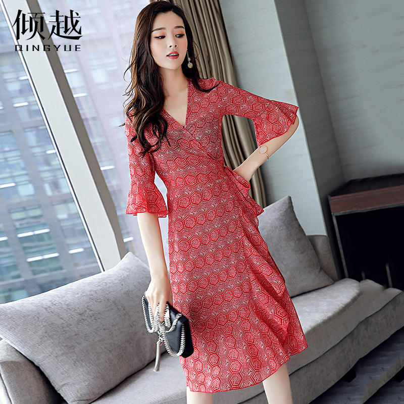 連衣裙女夏2017新款雪紡印花荷葉邊裙喇叭袖v領顯瘦系帶氣質a字裙