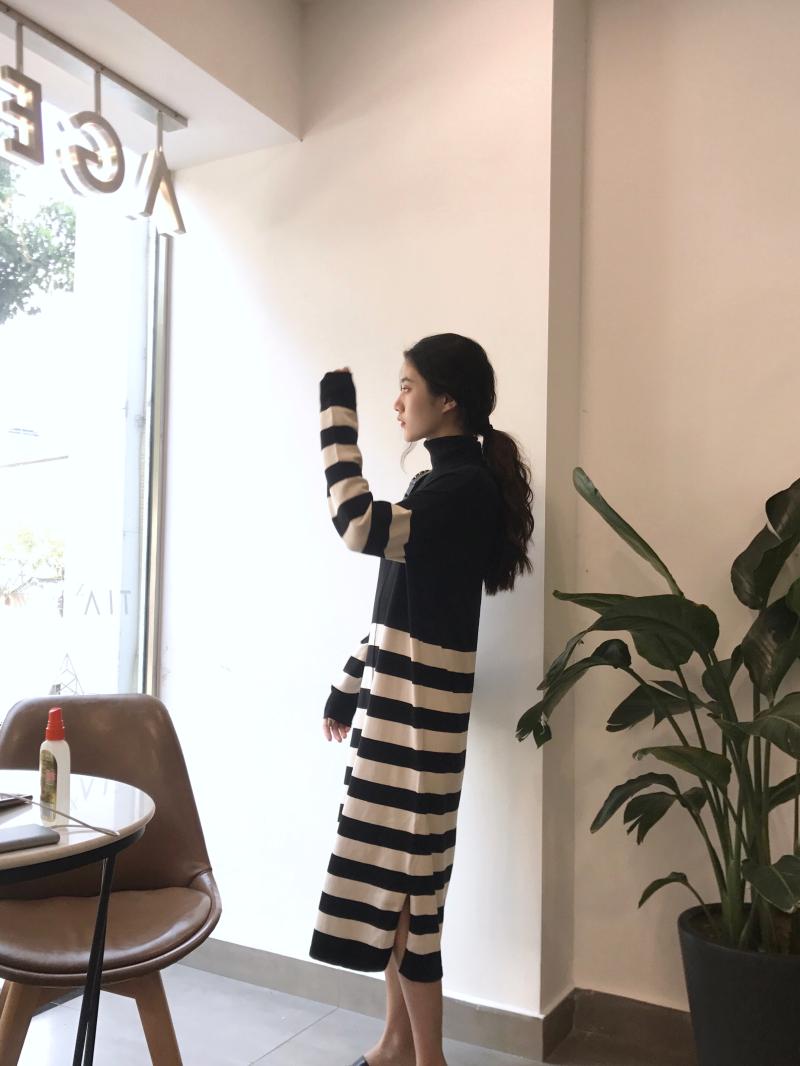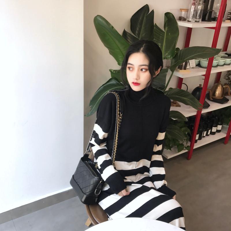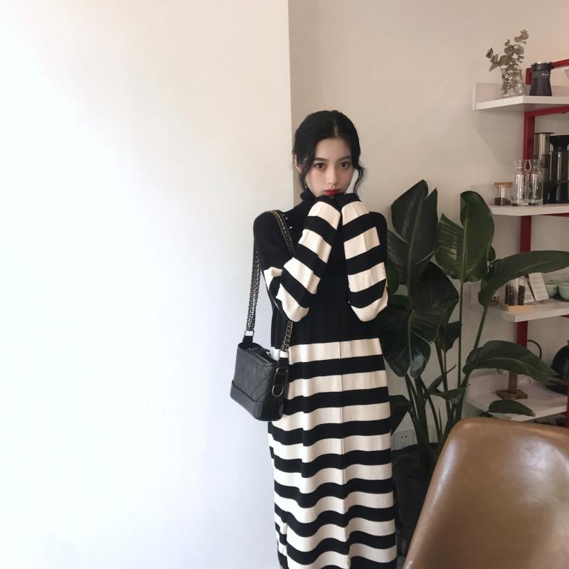 / 晚晚風新款韓版秋冬復古chic時髦百搭拼接條紋針織過膝長款連衣裙
