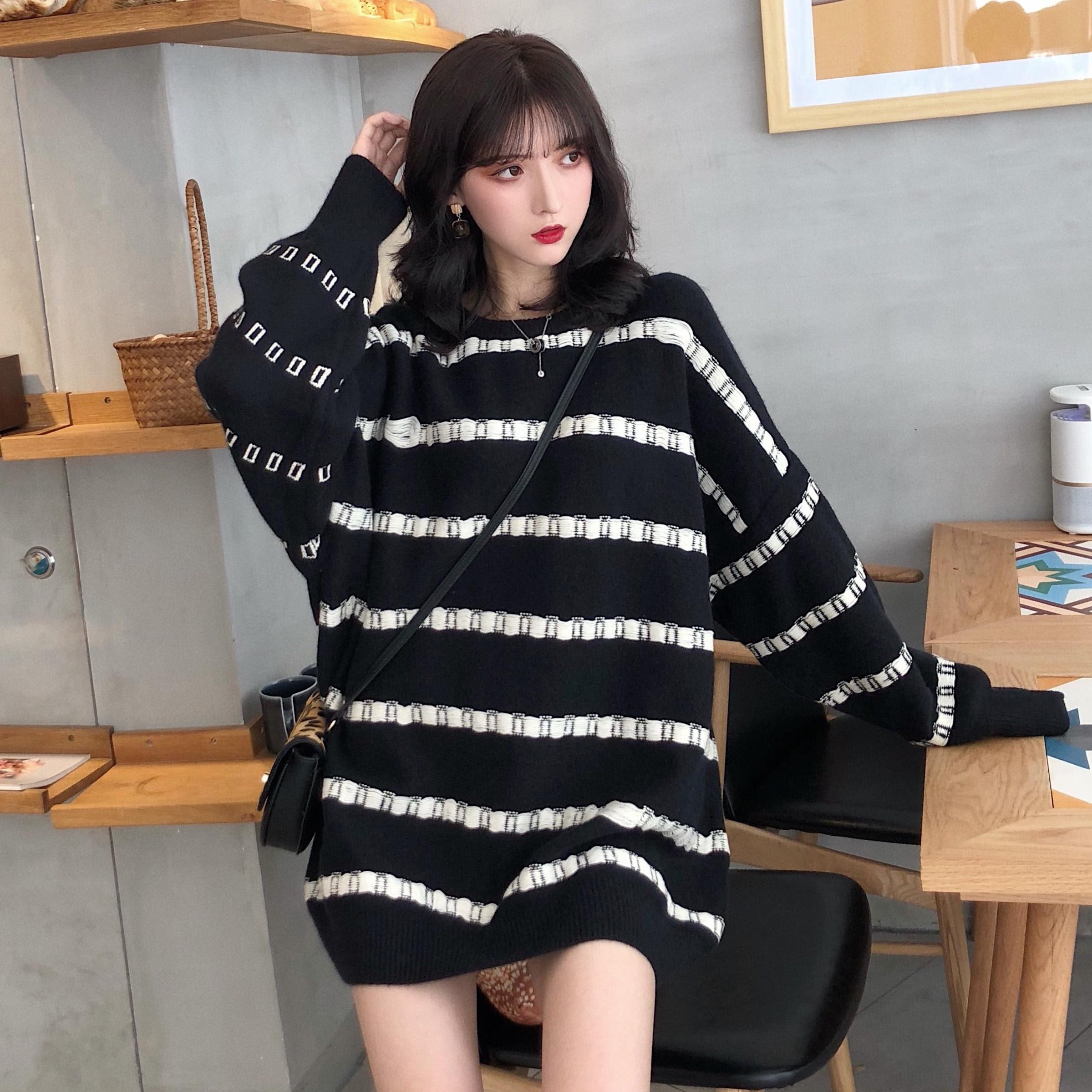 韓版chic百搭慵懶風oversize毛衣女寬松顯瘦條紋中長款減齡毛線衣